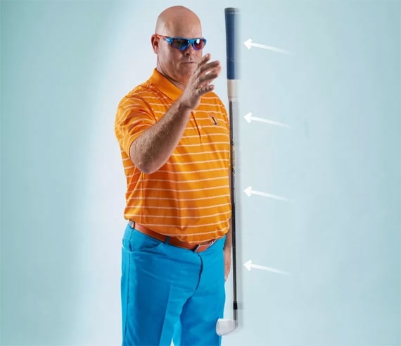 大多数高尔夫球手将球杆握把呈对角线穿过左手手掌握住,从与拇指根部相对的底端直到食指。我用这种方式握杆。就是本·霍根使用的握杆姿势。不过,从生物力学的角度来说,这也许不适合你。你必须要检查一下,因为如果不适合,你会很痛苦。试试这个:面对几英尺外的同组球友站直,双手下垂放在身体两侧。让他们扔一支7号铁杆给你。不要想怎么接,抓住空中飞来的握把,并在自己面前握住球杆。现在,阅读本文,看看如何将这个简单的测试转换为你的技巧。