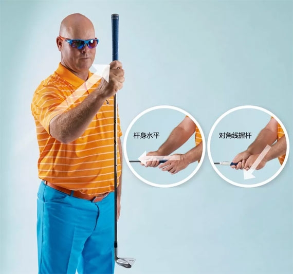 只用右手握住球杆,举到与腰部同高,球杆与地面平行(右上插图)。在其后方加入左手——它会自然地以一定角度加入,使握把以完美的对角线穿过你的左手掌。正常合拢双手。你的握杆是完美的。