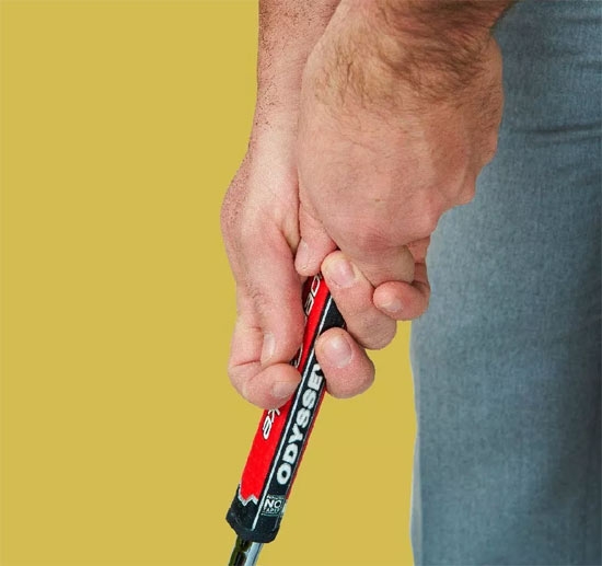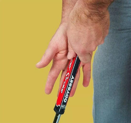 合上右手并倚靠握把固定“犬牙”(食指和中指)。大拇指放在握把上面,用其他手指裹住握把背面。你会感到与推杆有了更多连接、更容易摆正杆面