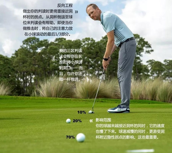 解药来了,要感谢我的“三区判读”法。面对任何超过20英尺的推击时,自球位至洞杯,将其分为三部分。推击的第一个1/3在你的整个判读中的重要性占10%。第二个1/3需要你投入20%的精力,而你推击的最后1/3,最接近洞杯的这部分,需要70%的注意力。这一差异源于推击在小球滚动接近尾声时更易出现拐点的事实,因为那时球的滚动速度在逐渐减缓。这一理论也有例外,但判读推击线更多基于球接近洞杯时的滚动方向,总比按照球的初始滚动判读推击线更有效,这是一个迅速提高你的果岭判读的好方法。