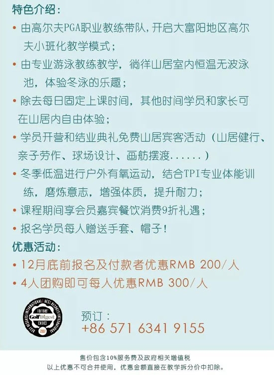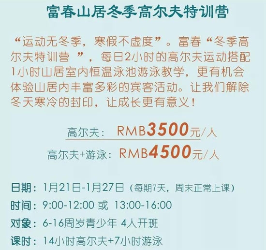 2018的夏天以肆意的暑气和直攀40°的高温光荣地完成了自己的使命。冬天即将接替短暂的秋天,隆重登场。如果暑假,你玩了一夏的手机,睡了一夏的懒觉。那么富春山居高尔夫冬令营,将是你重拾精彩假期的重要机会。