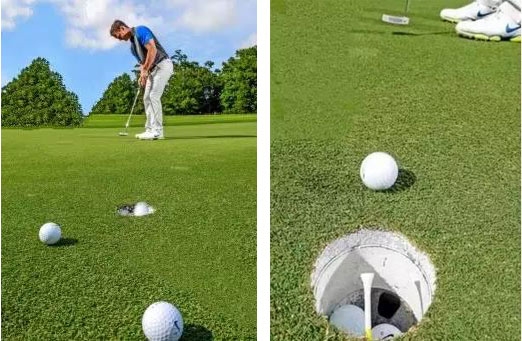 在洞杯后沿中间的位置插入一支球TEE,球TEE朝向小球位置。在距离洞杯10.16cm英尺的位置推6颗球,每次注意用小球将球TEE撞进土里更深一些。这个练习会帮助你缩小注意力范围,将注意力更多集中在球洞上。