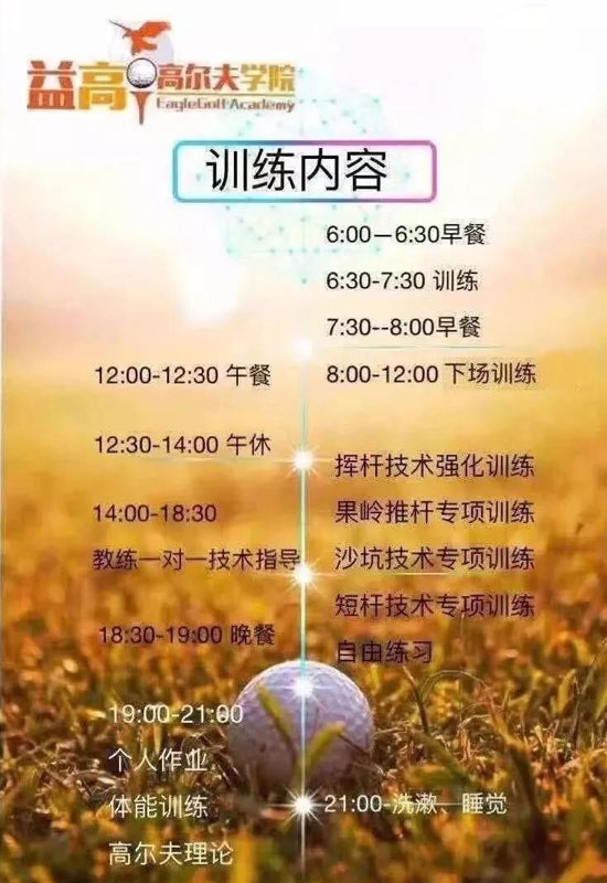 3. 培训:高尔夫教练配比(高级班1:3)、两名生活老师(男女各一名),高尔夫教练及生活老师24小时全程跟踪,全面管理孩子的学习、训练、安全和起居饮食等。