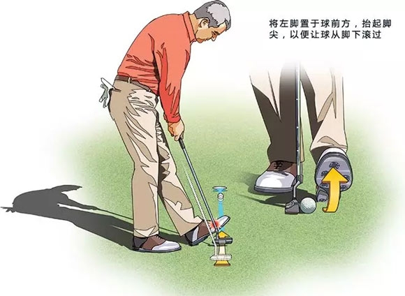 首先,摆出标准推击站位,然后伸出左腿,将左脚置于球的稍偏前方。接下来,抬起左脚脚尖,以便让球从脚下滚过。做出标准推击,当杆身碰到左脚时收杆。注意看,你的左腕外侧和击球都变得稳固了。此时不会出现甩手腕的动作。
