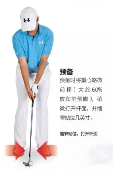 预备时将重心略微前移( 大约60%放在前侧脚),稍微打开杆面,并缩窄站位几英寸。