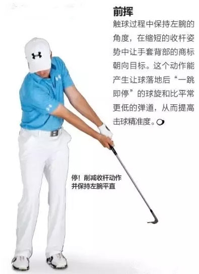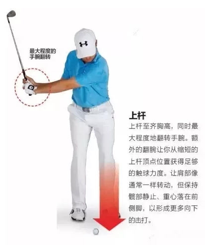 上杆至齐胸高,同时最大程度地翻转手腕。额外的翻腕让你从缩短的上杆顶点位置获得足够的触球力度。让肩部像通常一样转动,但保持髋部静止、重心落在前侧脚,以形成更多向下的击打。
