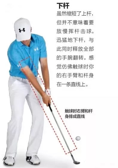虽然缩短了上杆,但并不意味着要放慢挥杆击球。迅猛地下杆,与此同时释放全部的手腕翻转。感觉仿佛触球时你的右手臂和杆身在一条直线上。