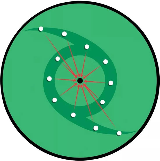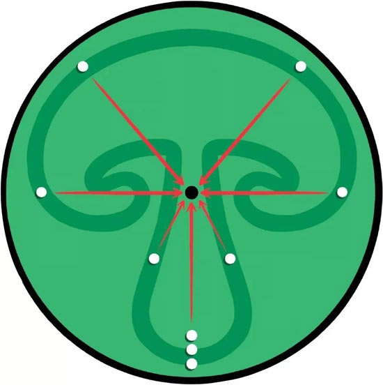怎么做:环绕洞杯3英尺的位置,放置8个球,然后在距洞杯4英尺和5英尺的位置再放2个球。形状应该像飓风的标志,洞杯就是风眼。你的目标是连续推进这10个球。
