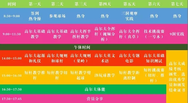 收费标准:3580元/位(含高尔夫服装:帽子、T桖、手套;每日中餐、水果、饮料;教学使用所需球具、结业证书)
