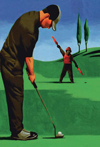 放松是指击球前用杆头敲敲地面、拉拉袖口,或者弄弄你的手套。这是很有道理的,因为它会在潜意识里提醒你马上就要开始了。如果你是一位很有悟性的选手,你也会明白为什么“放松“只是一些轻微的肢体动作,而不是较大幅度地重复抬头看旗杆或者习惯性空挥杆,因为这些带来你的眼神晃动,分散注意力。