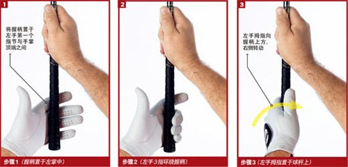 如果你关心自己的握杆动作,可以按照右面列出的步骤来做。我们在松林高尔夫学院就是这么教给学员的,这些步骤能够使你的双手处于合适的位置,避免大多数常见握杆失误。这个5秒钟的程序能够让你获得渴望已久的力量和控制力。