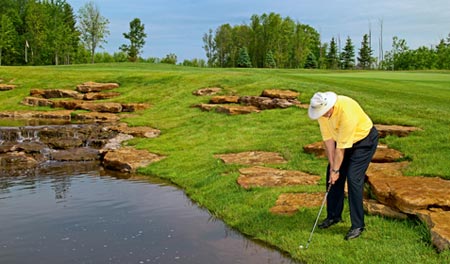 我可以宣布它为不可打之球,在远离水障碍的地方抛球,然后利用劈起击进攻果岭。不幸的是,这样会被罚1杆,而且抛球时球可能会停在不理想的位置。如果抛球的球位理想,接下来做出了漂亮的劈起击,一推进洞,我将会打出博基;如果抛球的球位不理想,我将会打出双博基。