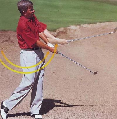 因为沙地比草地的阻力要大,它对球手力量的要求也更大。如果你想让打出的球能够和在草地上打出的球一样远,你就要加大一点挥杆长度。想要保持送杆流畅的话,就要注意:你的脚踩入沙里越深,打出的距离越短。挥杆动作的圆弧位置低了,你打飞的沙子就多了,传到球上的力量就小了。