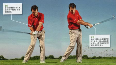 “在杆头穿过草皮时,让原本放松的手臂和球杆突然发力。”