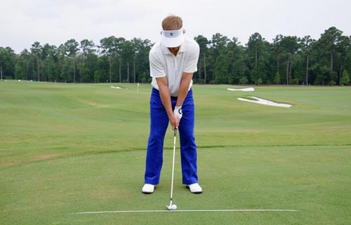 如何掌握好劈杆的距离呢,你可以通过调整球与双脚这三点所形成的三角形来实现。如果是长距离劈杆,那么就让这个三角伸大些。当球离果岭较近时,将双脚之间的距离缩小,球杆也相应地握短,身体站得离球略近。这种击球准备的姿势事实上限制了上杆的幅度,从而缩短了击球的距离。