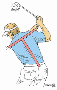 我们知道,要将球打得远,需要使用躯干的大块肌肉,这是身体主要的力量来源。如果我们将身体作为一个机器,那么脊椎就是这个机器的核心,它将身体其它部分整合了起来,使其充分发挥作用。正确的利用身体大块肌肉,最为重要的是认识并做到脊椎的正确位置和角度。在整个挥杆过程中,虽然躯干是旋转的,但脊椎角度仍需保持不变,直到送杆。