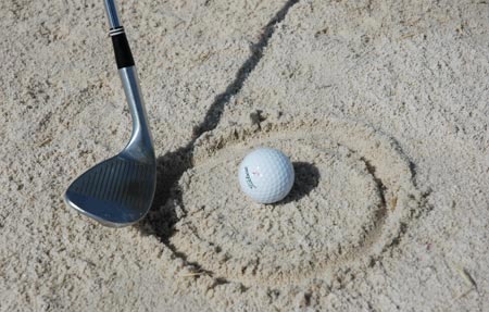 我们在进攻果岭时,常常会将球打入果岭边的沙坑,这也是球员们最不愿意发生的状况,特别是初学者甚至会在沙坑里打上无数杆。还有一种情况就是即便将球打上了果岭,球也很难靠近旗杆。下面就教大家在正常情况下的果岭边沙坑如何救球。