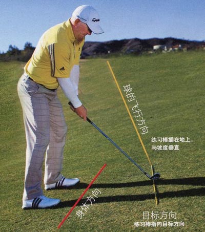 面对不在平地上的球位,关键在于搞清楚坡地对球的飞行弹道的影响。可以用两根练习棒来观察。把第一根练习棒放在地上,指向目标方向。另一根插在地上,与坡度垂直。然后,注意;插在地上、与坡度垂直的练习棒,代表的是沿目标线方向挥杆时球大概飞出的方向。坡度越大,练习棒就越倾斜,击球弹道离目标线方向越远——即使预备站位与目标方向一致。