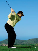 图片上的球手高举球杆,想打出低弹道的轻微右曲球。对于许多人来说,这个姿势也许属于非正统,或者说简直太难看了。实际上,任何想打出低弹道的轻微右曲球的人来说都可以利用这个姿势。注意右臂几乎完全直立,而右腕向后弯曲。这种结合对于打出稳固的球来说相当重要。左肘稍微弯曲,可以帮助打出由左向右的弹道。