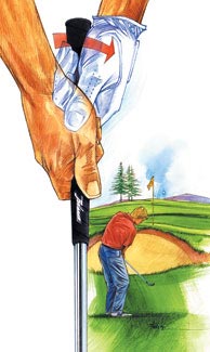 可以到练习场上试试这种挥杆。你将体会到,左手转动到杆面下越多,弹道就越高而短。这个技术可以使用在多个方面:果岭旁的切球、球道上和长草区也可以使用挖起杆完全挥杆。对于下坡切球和面积小的果岭有很有用。