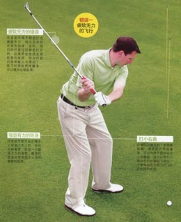 老年球手中最常见的错误之一是,他们在果岭附近击球时.右手动作过大.试图加大杆面倾角.使之能顺利滑进小球下方,尤其是当他们需要让小球迅速越过前方障碍区时。