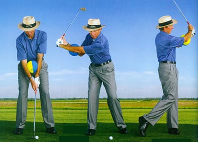 为了找到双手、手臂和身体协调一致完成挥杆的感觉,在双手、前臂之间肘关节以下放一个海绵球,或者是在两臂之间夹住一条毛巾。不管是哪种方法,都需要在练习半挥杆时保持物体不动。
