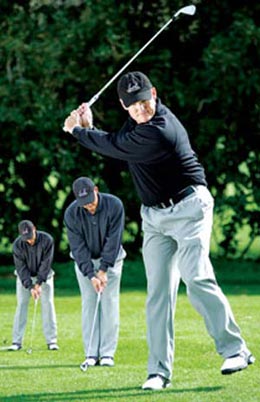 当你对挥杆重心的转移感到很有把握后,实际击球,进行几次挥杆。记住,当你离开球的时候,前脚迈开,指向瞄球的地方。你迈出的步子不能太大也不 能太小。进行几次挥杆以后,用你的短铁和中铁击球。目的就是让你的身体重心在上杆和下杆的后半个阶段转移到身体后面,并形成一种图景固化在头脑之中。这有 助于你永远消除糟糕的重心逆转。这样,流畅击球和降低杆数都不在是梦想。