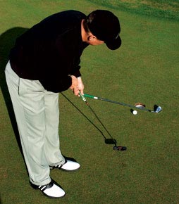 这个练习是你日常练习中的一个常规部分,从中你可以学到如何加速杆头速度,并从短推杆中获得自信,这些对于获得较高的杆数都是很重要的。如果你感到很冒险,可以试试这个短杆技术。只需记住将杆身与球洞垂直,以便让球直接滚入球洞之中即可。