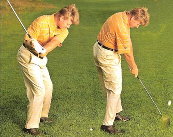 如果球在草的上面,正常挥杆,但是一定要做好打出倒旋较少的“flyer”的准备,尤其是当草比较干的时候。我通常都会选择小一号的球杆轻松挥杆。