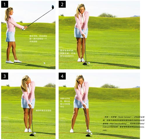 大部分业余球员做不到使杆面正确地瞄准目标。如果对准的是一棵远距离的树,他们的杆面有可能瞄准的是树的左侧,或者身体站位偏右,也可能两者同时发生!如果是这样,必须在挥杆中做出很多补偿才能命中目标。然而这种调整只是偶尔奏效,最终会导致挥杆失误。