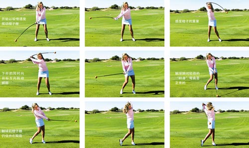具体使用方法如下:分别用左手和右手执杆挥动橙子鞭,从而平衡两侧的肌肉。注意鞭子在挥杆顶点时会有自然的暂停了吗?这能让下杆的动作顺序变得非常自然,使下半身的重心向目标方向转移,上半身也随之转动。最初,你可能感觉挥动速度较慢,其实不然。事实上,你在合适的时间、沿正确的路径、打出了恰当的速度挥杆。
