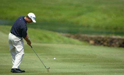 注意,一定要保持左臂伸直并充分伸展。挥杆的时候,左臂起到的是杠杆的作用,如果弯曲左手,则杆头将随着移动,所以,必须在通过击球点的时候保证左手姿势与瞄球姿势相同,也就是要保持左手在瞄球和通过击球点时是伸直的。可以允许在上杆的时候稍微的自然弯曲。