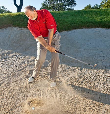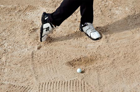 这是一种很棒的方法,而且特别适合果岭边沙坑球位,但问题是,只要在正式击球前你的球杆碰到了沙子,你就会被罚两杆。但是,这种规则不可能限制你的训练,因此你下次练习沙坑球时,可以尝试一下这种预演准备程序。下面是详细做法。