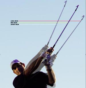 反之,越是较短一些的铁杆,你所站的位置离球越要较近些,而挥杆平面也该更陡更垂直些。而这也恰恰说明了一些球手能够很好的处理短铁,却很难搞定长铁的原因。因为他们并不晓得长铁的挥杆平面应该略扁平些。了解不同的铁杆其对挥杆的不同影响,以及如何做出相应的对策与调整就成了问题的关键所在。接下来,我们就要帮你扫清这些障碍,完善你的挥杆轨迹,提高你的击球技巧。