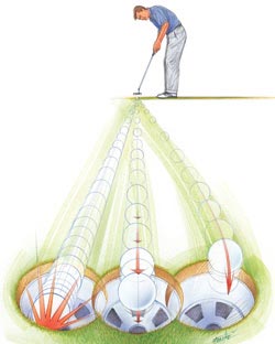 在距球洞4英尺远的地方放置3个高尔夫球(4英尺的距离仅仅比推杆长一点)。你的目标是让每个推杆都成功,每个推杆都有不同的速度。这三种速度应该这样推动高尔夫球,以便: