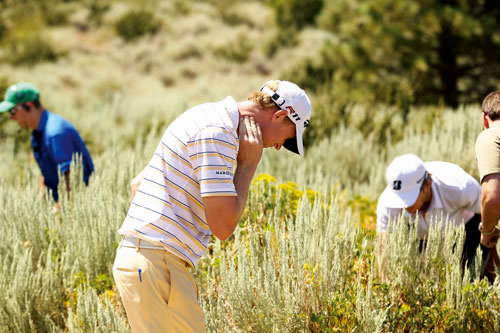 开球右曲,进入球道边长草,没有打暂定,直接去找球;没找到球,就在球道边抛球打了下一杆。