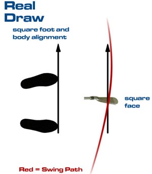真正的左曲球是球从右往左飞行一点距离,如果你是用8号铁或者以上的杆,这个距离大约在5码左右,如果你用的是木杆击球,则这个距离大约在10码左右。下面是真左曲球击打方法的示意图: