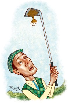 球友提问:我同组的一个朋友用挖起杆全力击球,但我们都没看到球飞出去。原来是他脚下的烂泥像胶水一样黏,球被粘在杆面上!太不可思议了。按照规则该如何应对呢?——奥古斯托·马奎斯 ,电子邮件