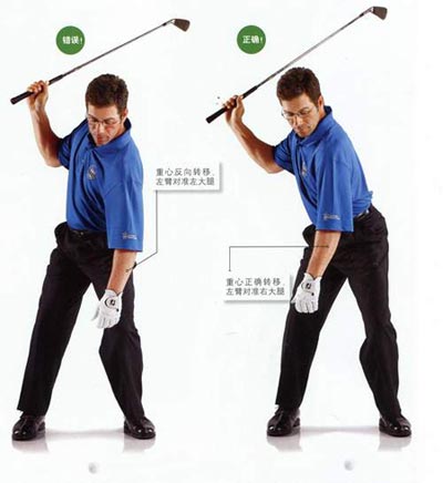 采用标准站位,右手握球杆,上杆至顶点。如果你使得身体和重心正确地移至球后方了,你的左臂将会对准右大腿。如果你使得重心反向转移,利用手臂的力量太高球杆,你的左臂将会对准左大腿。你可以把这种训练法加入赛前热身当中,当你在发球台或球道上打偏之后,也可以采用这种方法。