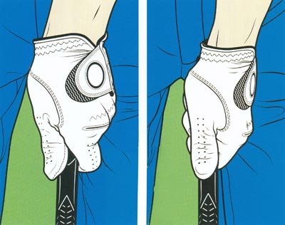 如果要打出从右向左的弹道,我会在握杆时转动左手至能看到3个指关节的位置(左图的强势握杆)。如果能看到的指关节越少,就越容易导致球从左向右飞。有时候右曲未必是坏事(右图为弱势握杆)。