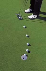 短推(2-6英尺)绝对至关重要。短推失误就相当于面对障碍区救球或宣布不可打之球,你注定要损失杆数。如果你还不了解我们的“短推圈训练法”,可以看看右侧远端图中菲尔·米克尔森的训练方法。在练习果岭上找一块倾斜区域,把10个球放在距离洞杯3英尺处,组成一个圆圈,练习推击,直到能够连续10次推击进洞为止。菲尔每周都要采用几次这种训练法。这样不仅能够练习短推,还能熟悉各种不同的偏移路线。只有纯粹的上坡和下坡推击才会笔直滚向洞杯,其他的推击都会有一定的偏移(下坡推击的偏移幅度大于上坡推击)。