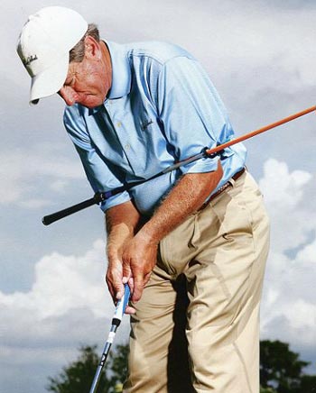 用一支旧杆身。两端绑在双臂的肘部 ,在目标线上放置另一支杆身——对于直推那就是你的球线。站位的时候让手肘上的球杆沿着地面上的杆身方向来确保肩膀方正。