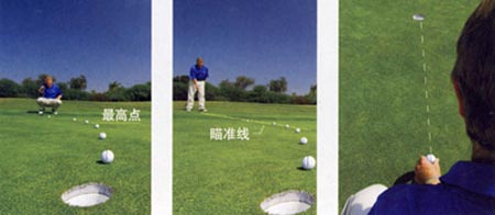 1、判断好你所需的左右偏移之后,注意球将会停止向远离球洞的的方向移动、改为向着球洞移动的那一点,即左右偏移的最高点。这一点——而不是球洞——才是你的瞄准目标。