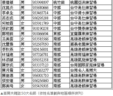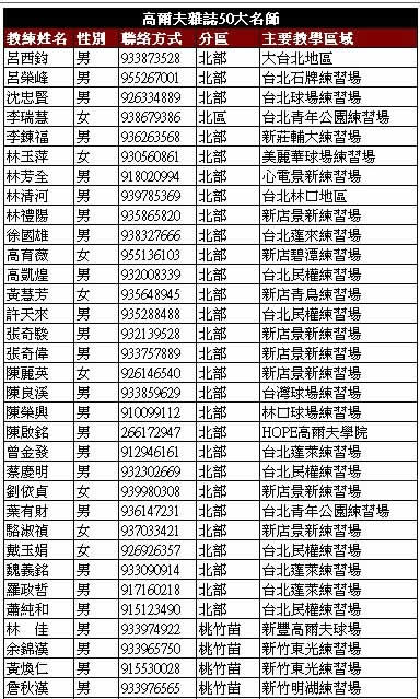 台湾地区教练推荐的高尔夫杂志50大名师, 是您在想找教练学习或精进高尔夫技巧时,最佳的参考指南。入选的教练们不仅具备丰富教学经验,扎实的专业素养,同时对高尔夫教学也充满热诚。另外也透过访问,告诉你高尔夫挥杆影像教学的秘密,以及什么是个性化教学。
