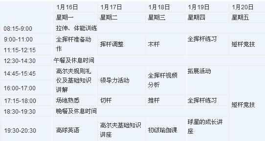 第一期:2012年1月16日-20日(初学班):未系统接受过高尔夫培训的青少年。费用为2500元/人。