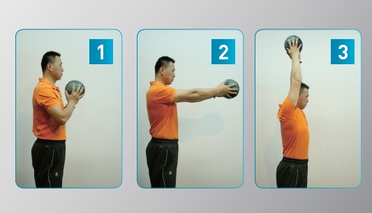 身体直立双脚分开与肩宽,双手持球放在颈前,向前推球至与肩平后还原。接着将球推向头上至双臂伸直后还原,向前推2次向上推2次,接着向前推3次向上推3次,根据个人能力做到8至15次。
