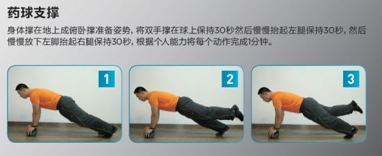 身体撑在地上成俯卧撑准备姿势,将双手撑在球上保持30秒然后慢慢抬起左腿保持30秒,然后慢慢放下左脚抬起右腿保持30秒,根据个人能力将每个动作完成1分钟。