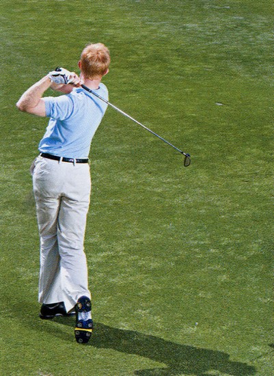 4、你一旦掌握了这种上挥杆至顶点的正确姿势,那么你所需要做的就是在开始下挥杆时扭转上体,让你的肩部、背部和臀部引导球杆挥向球后。这些大块肌肉基本不会出错,所以无论参加什么样的比赛你都能进行连贯而有力地击球。