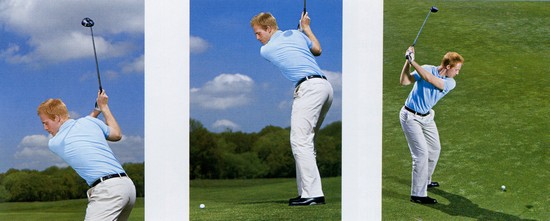 2、臀部转动约45。,但不要转得像肩部那么远。这就是尼克从大卫·李德贝特那里学到的x因素。将肩部转成900,而臀部转成45。,用你那强有力的手臂挥动球杆,动作就会协调连贯了。