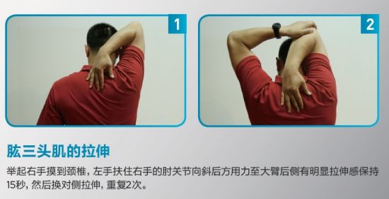 举起右手摸到颈椎,左手扶住右手的肘关节向斜后方用力至大臂后侧有明显拉伸感保持15秒,然后换对侧拉伸,重复2次。